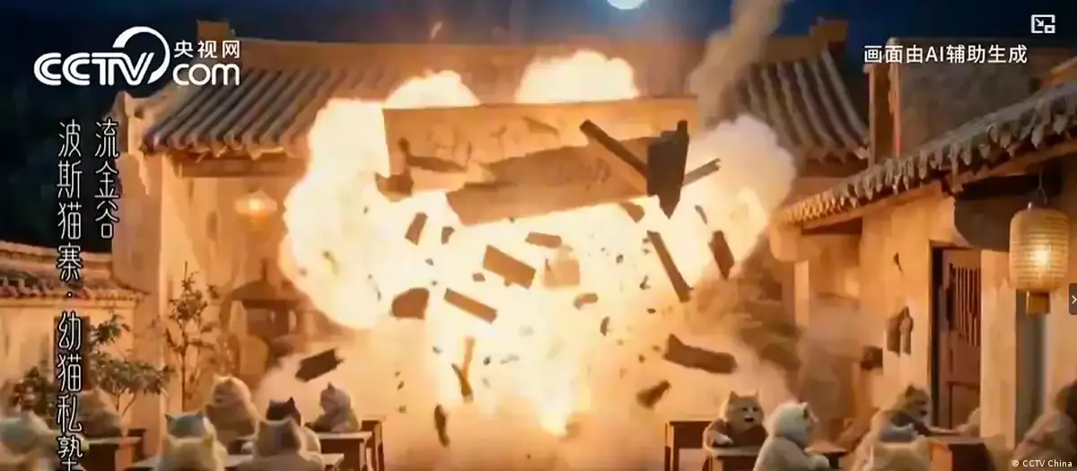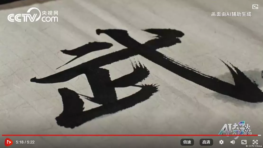 CCTV的AI动画以中国古代的武学智慧作为结尾,讲到:“武之极致,不在戈,而在止”。图像来源: CCTV China