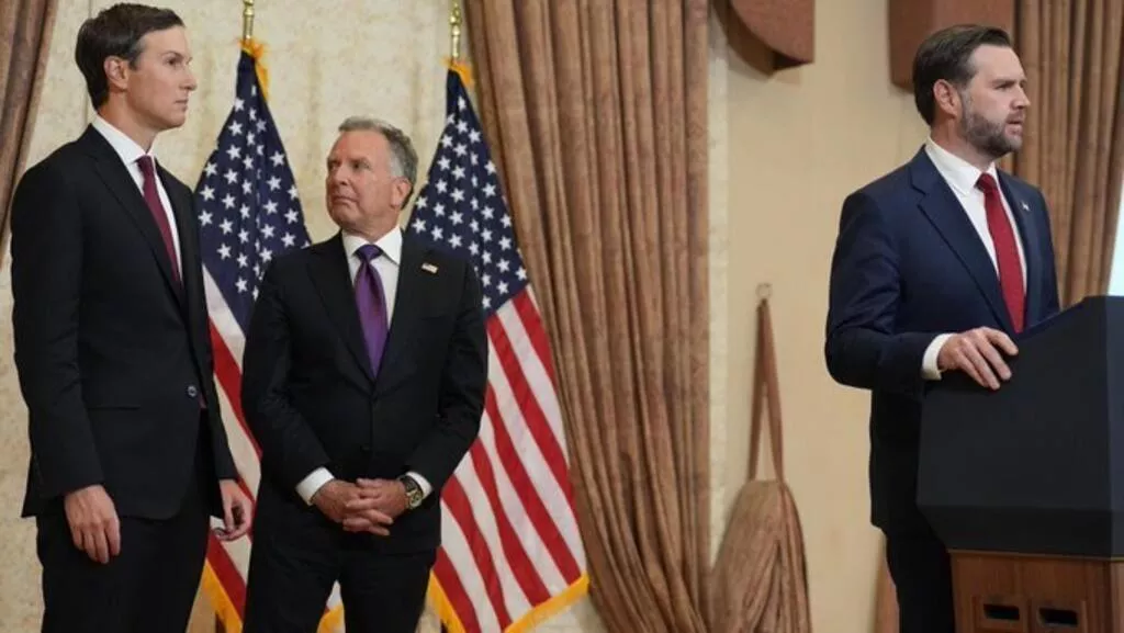 2026年4月12日星期日,在巴基斯坦伊斯兰堡,美国副总统万斯(右)在与伊朗代表谈判后举行新闻发布会并发表讲话,川普女婿库什纳(左)和特使史蒂夫·维特科夫在一旁聆听。 © AP Jacquelyn Martin, Pool—Associated Press