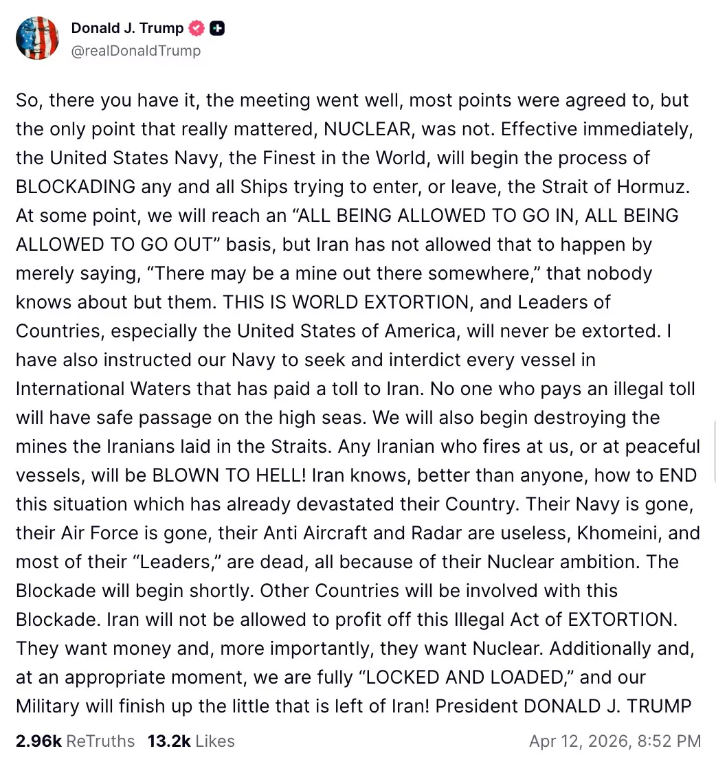 美国伊朗伊斯兰堡会谈未能达成协议,美国总统特朗普(Donald Trump)当日在社交平台Truth Social上表示,美海军将即时阻止任何船只出入霍尔木兹海峡,并在国际水域搜查并扣押每一艘向伊朗缴纳过通行费的船只。任何胆敢向美方或者和平船只开火的伊朗人将被“炸进地狱”。