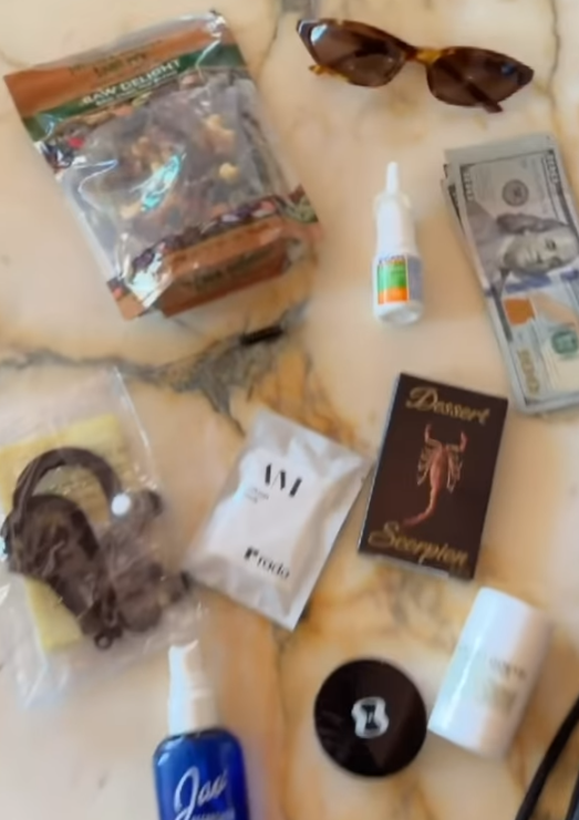 水果姐还向粉丝展示了她的音乐节随身包中必备物品,包括墨镜、维生素、消毒液、润唇膏、除臭剂、坚果干粮和首饰等,强调准备充分才能“生存”音乐节。