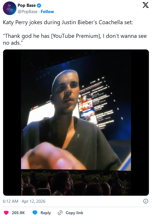 在另一段视频中,两人在红色灯光下亲密依偎,随着比伯演唱《Speed Demon》轻声合唱。此外,水果姐还调侃比伯在演出间隙用YouTube查看自己的音乐视频挑选曲目,笑称:“幸好他开了YouTube高级版,我可不想看广告。”