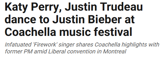 据4 月 12 日报道,加拿大前总理特鲁多与女友、流行歌手Katy Perry(水果姐)近日一同亮相美国加州的Coachella音乐节,两人在比伯(Justin Bieber)演唱《Baby》时同框跳舞,现场气氛热烈,引发外界热议。