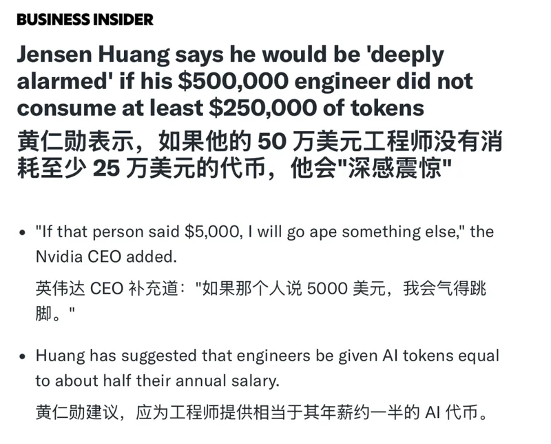 3 月下旬的英伟达GTC大会上,黄仁勋说公司应该给每个工程师配一笔 token 预算,金额大约是基本工资的一半,让 AI 把他们的产出放大十倍。