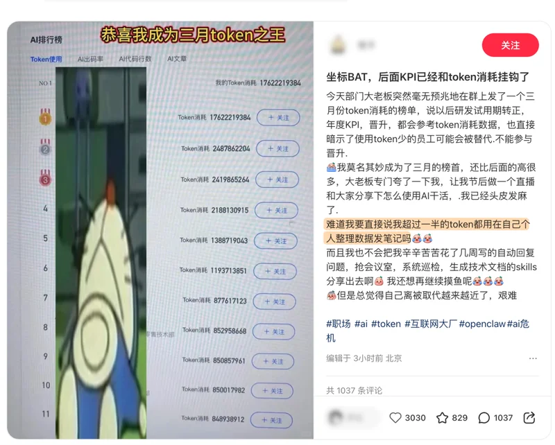 一个自称在 BAT 大厂(首先 B 排除百度)的网友说:部门突然开始搞 token 消耗排行榜,以后试用期转正、年度KPI、晋升,都要参考这个数据,甚至用得少的人,可能被替代。
