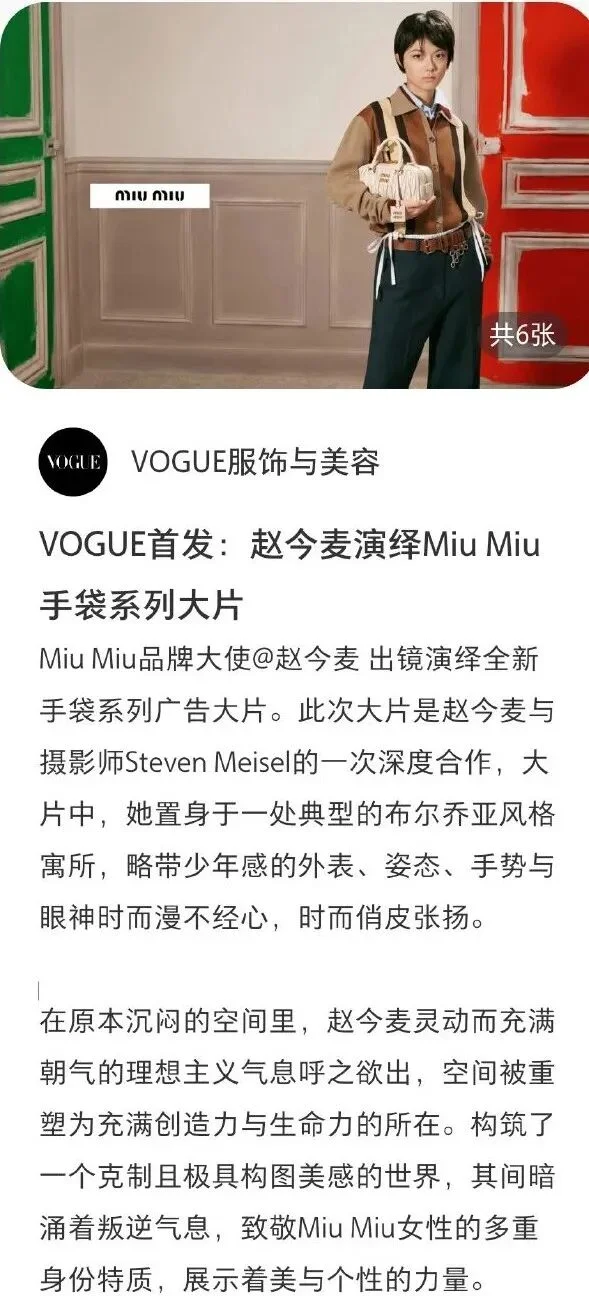 次次有争议。有人说,严重怀疑Miu Miu内部混进了赵今麦黑粉,一边给最好的待遇一边生产最丑的图。其实,其他代言人的图也没好到哪里去。。或许这就是Miu一贯的风格,平等地祸害每一位女明星。