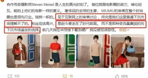 拿着这些“意见领袖”的认证和背书,粉丝怼起人来腰板都更硬了:但凡有人说不好看,那就是你不懂时尚,你太下沉;说风格不适合麦麦,那就是你不尊重多元,审美太狭隘;说摄影不好,什么?传奇大师你也敢质疑?!