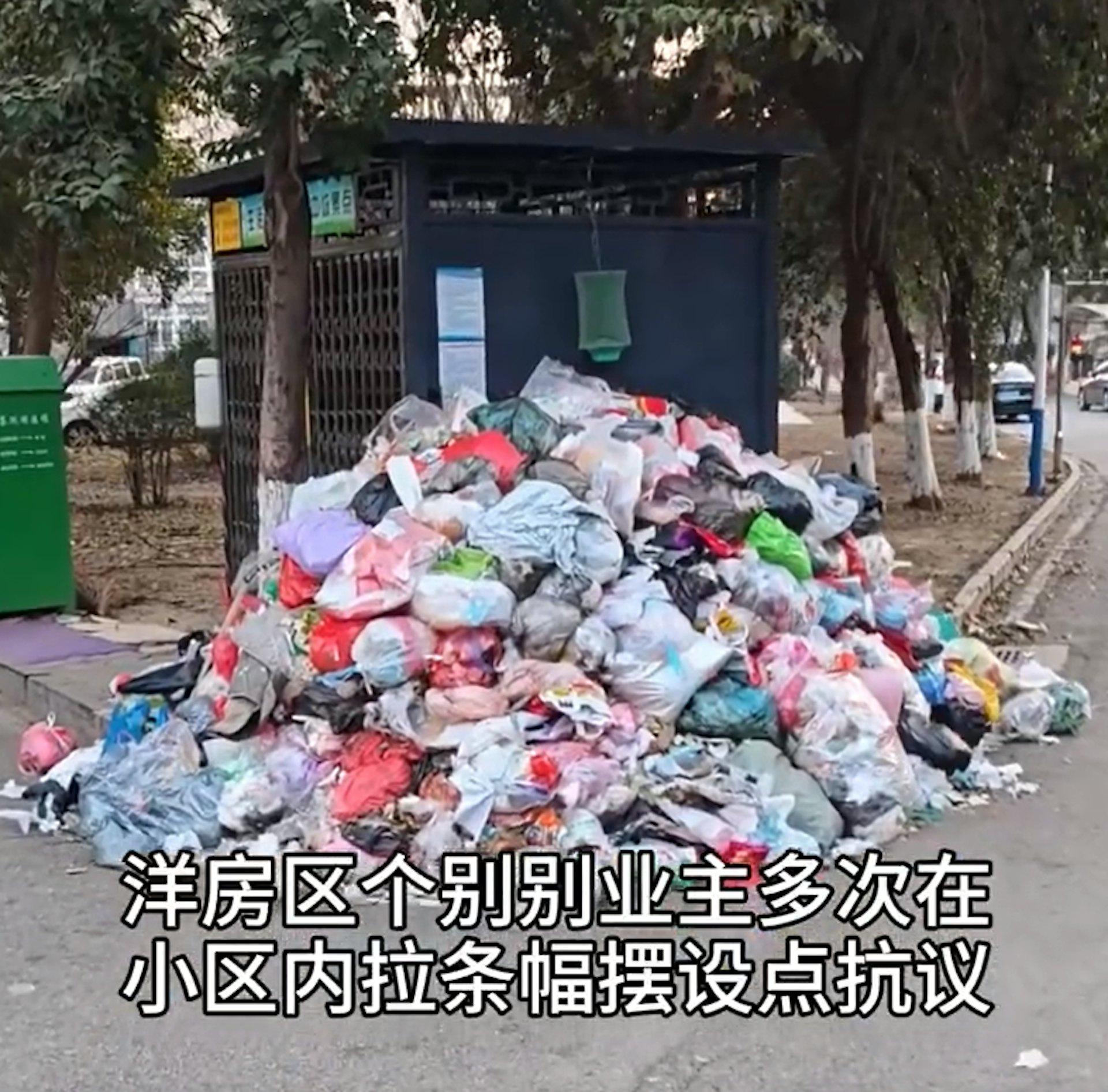 图为物业管理公司撤场后,小区楼下堆积如山的垃圾。 (网络图片)
