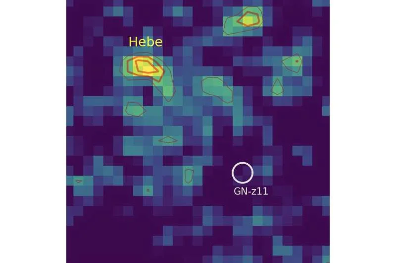 2024 年,马约利诺及其团队在 GN-z11 星系的晕轮中发现了一个异常信号。GN-z11 是目前已知早期宇宙中最明亮的星系之一。研究团队借助韦布望远镜搭载的近红外光谱仪 NIRSpec-IFU,在距离主星系仅 3 千秒差距处、一个名为“赫柏”的小型伴天体上,探测到一条微弱的发射谱线。
