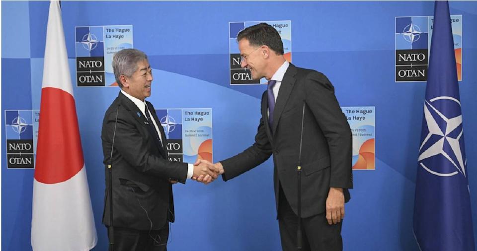 2025年6月24日,在荷兰海牙举行的北约峰会期间,北约秘书长吕特(右)与日本外相岩屋毅握手。(图/达志/美联社)