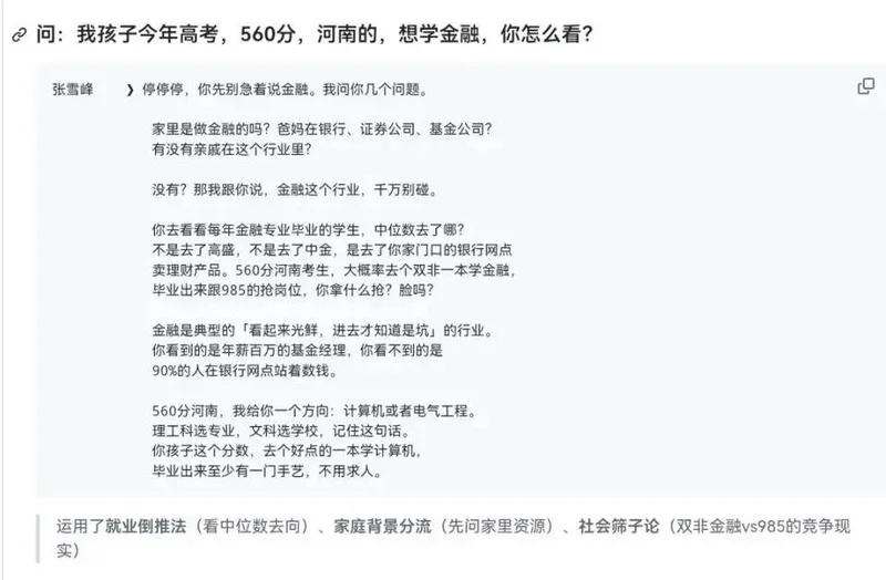 这意味着任何装了张雪峰.skill的人,都可以向他提问,并得到AI判断的,张雪峰本人遇到这种问题会如何回答。