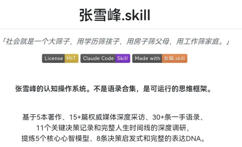 据说,张雪峰已经被“炼化”、蒸馏成张雪峰.skill了。开发者声称,他们用张雪峰生前的5本著作、15+篇深度采访、30多条语录和完整人生时间线,提炼出了他的“5个核心心智模型、8条决策启发式和完整的表达DNA”。