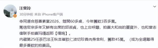 据悉,活动主题名为“寺同道合慈善素宴2026”,现场席开60桌,筹集善款300多万,对比去年稍逊一些,但整体的氛围却丝毫不减,尤其是诸多80后记忆中港星,这其中包括叶子媚、邱淑贞、袁咏仪、温碧霞、曾宝仪、曾国祥等等。