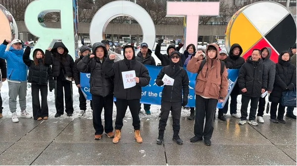 2026年2月3日,任先生(前排左一)参加在多伦多市政府广场举办的茉莉花行动。(任先生提供)
