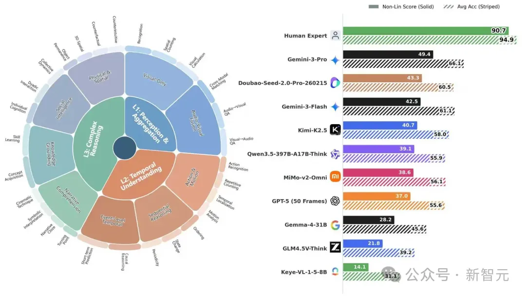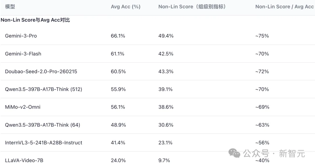 评测结果显示:人类专家的非线性得分为90.7(传统Acc为94.9),而当前最强的商业模型Gemini-3-Pro得分仅为49.4,开源模型Qwen最佳结果为39.1。