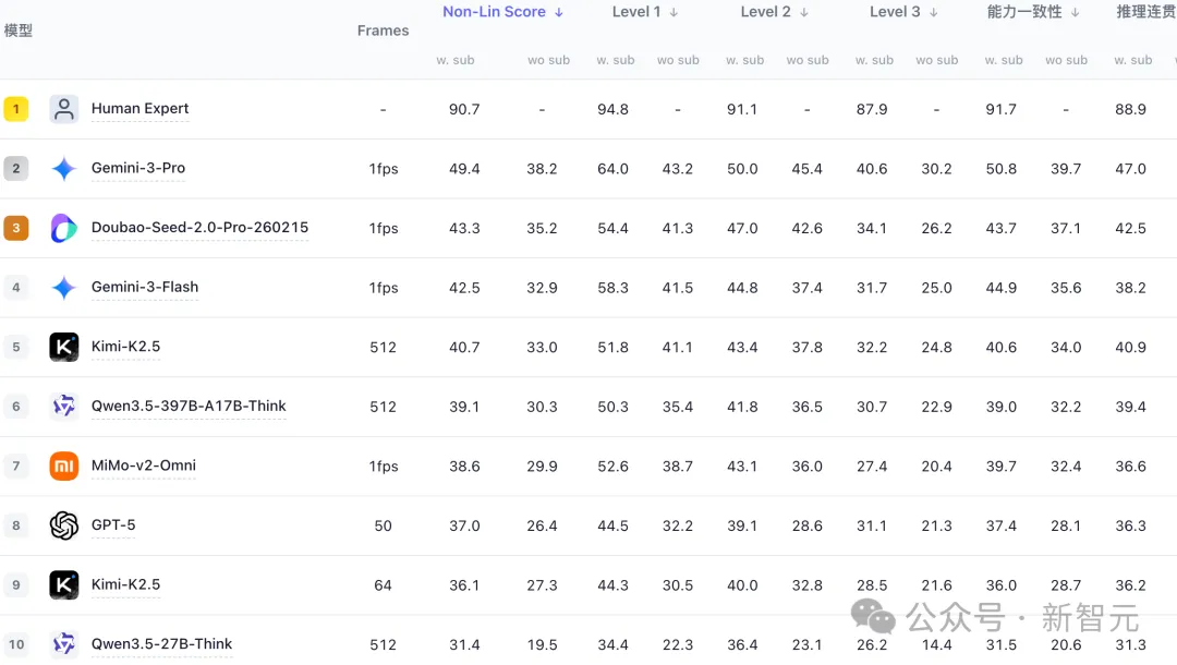 例如,Qwen3.5-122B-A10B-Think(64 frames)在无字幕和有字幕设置下,分别带来+3.8/+5.8的提升。这说明,显式文本语义仍然是很多模型完成多步推理时重要的「锚点」。