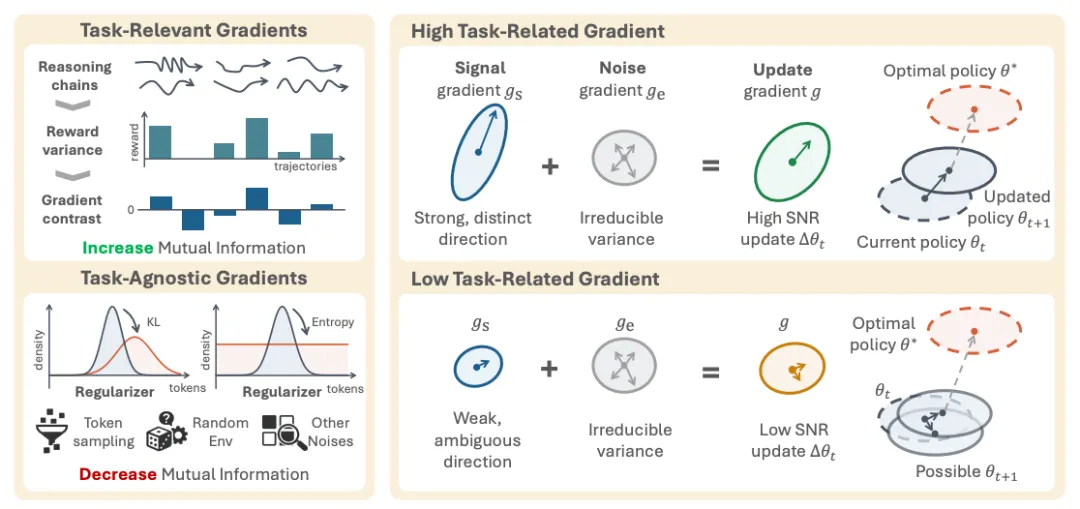 图2|RL更新的信噪比(SNR)示意图。左:总梯度分解为任务梯度(随着输入奖励方差的增加而锐化)和正则化梯度。正确的高奖励方差产生强任务梯度和更好的收敛性(高信噪比);低奖励方差使正则化梯度占主导地位,产生不稳定的更新和输入无关的推理(低信噪比)。