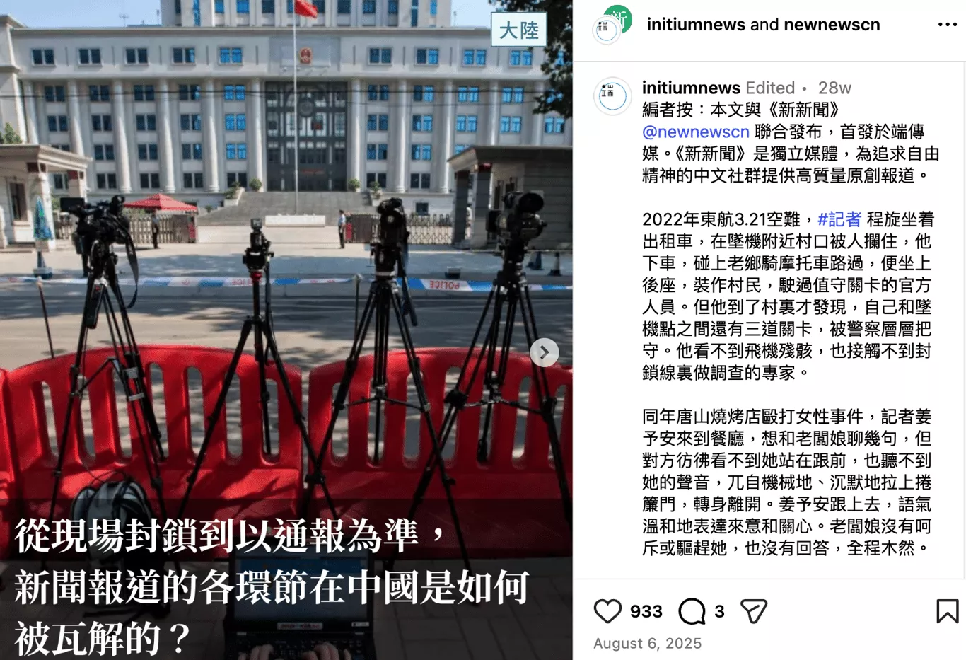 《新新闻》与《端传媒》合作报导,谈中国媒体当今困境。(撷取自《新新闻》Instagram)