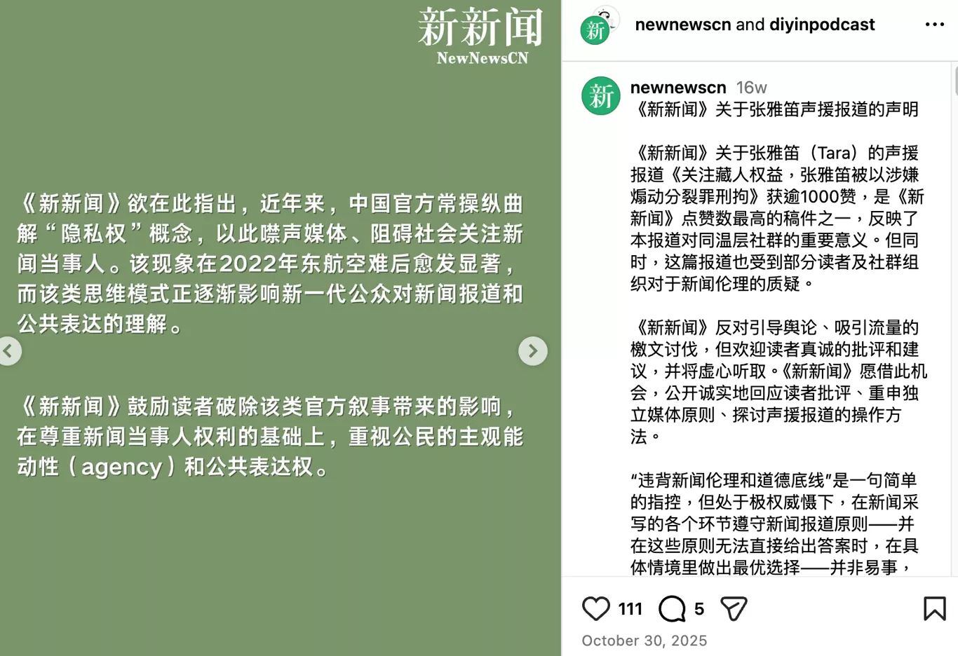 刊出张雅迪声援报导一个月后,《新新闻》再刊出报导声明。(撷取自《新新闻》Instagram)