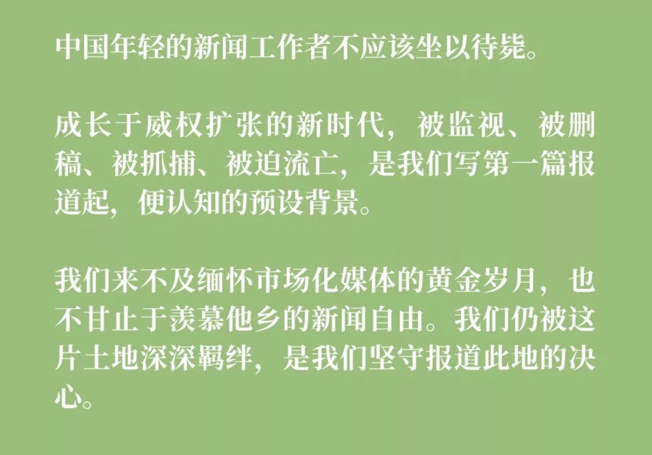 2025年年中,《新新闻》与《端传媒》合作报导〈从现场封锁到以通报为准,新闻报道的各环节在中国是如何被瓦解的? 〉,写下如今的中国新闻行业为何令人绝望。报导最末段,是关于这一代中国记者们绕过大环境限制,继续做新闻的尝试故事,段落标题写着「摸着石头过河、或成为那块石头」——《新新闻》也是其中一块石头。