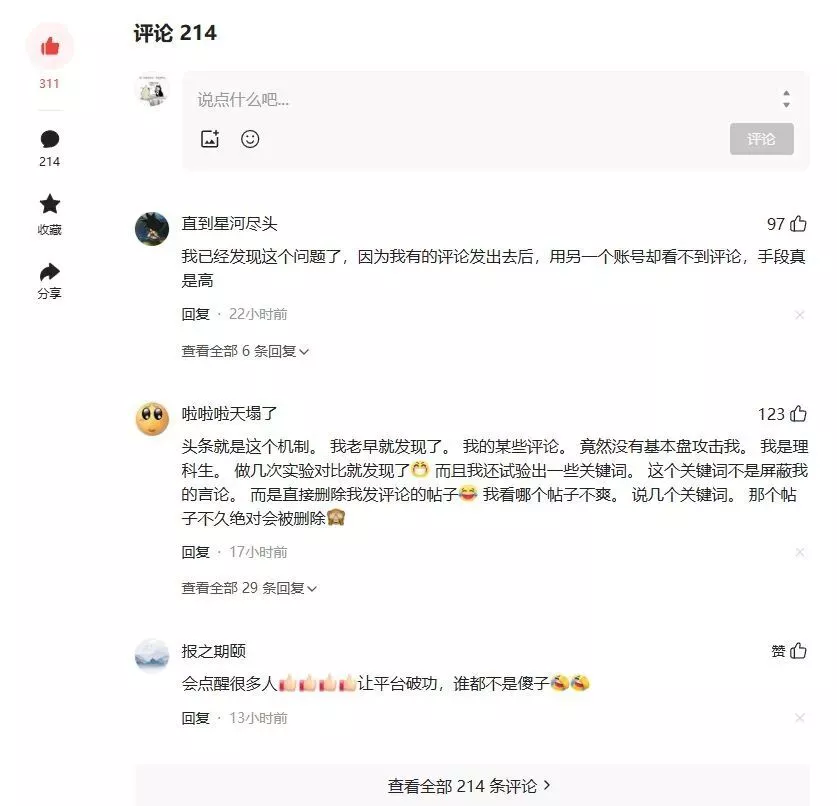 半天200多条评论,讽刺的是,半天后这篇文章就火速如同文章中所写的那样,被影子屏蔽(没提示被删贴,但只有自己能看到)。
