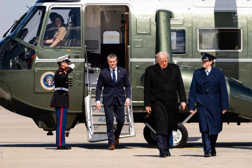 上个月,马里兰州安德鲁斯联合基地,国防部长海格塞斯和特朗普总统。海格塞斯已要求军队各军种采用人工智能。