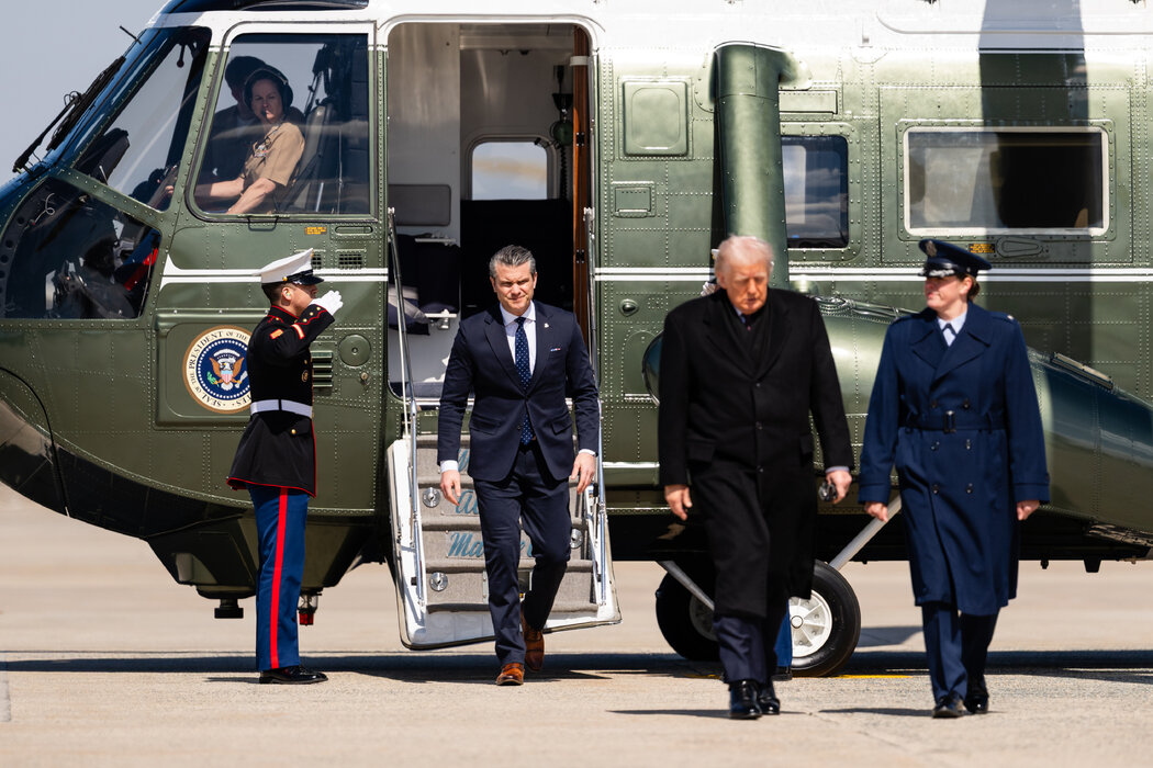 上个月,马里兰州安德鲁斯联合基地,国防部长海格塞斯和特朗普总统。海格塞斯已要求军队各军种采用人工智能。 Eric Lee for The New York Times