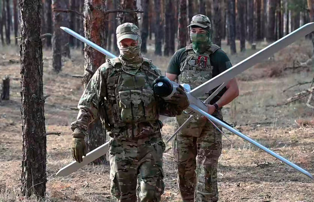 俄罗斯士兵在乌克兰某未公开地点搬运一架“柳叶刀”无人机。这张照片截取自俄罗斯国防部新闻处8月发布的视频。 Russian Defense Ministry Press Service, via Associated Press