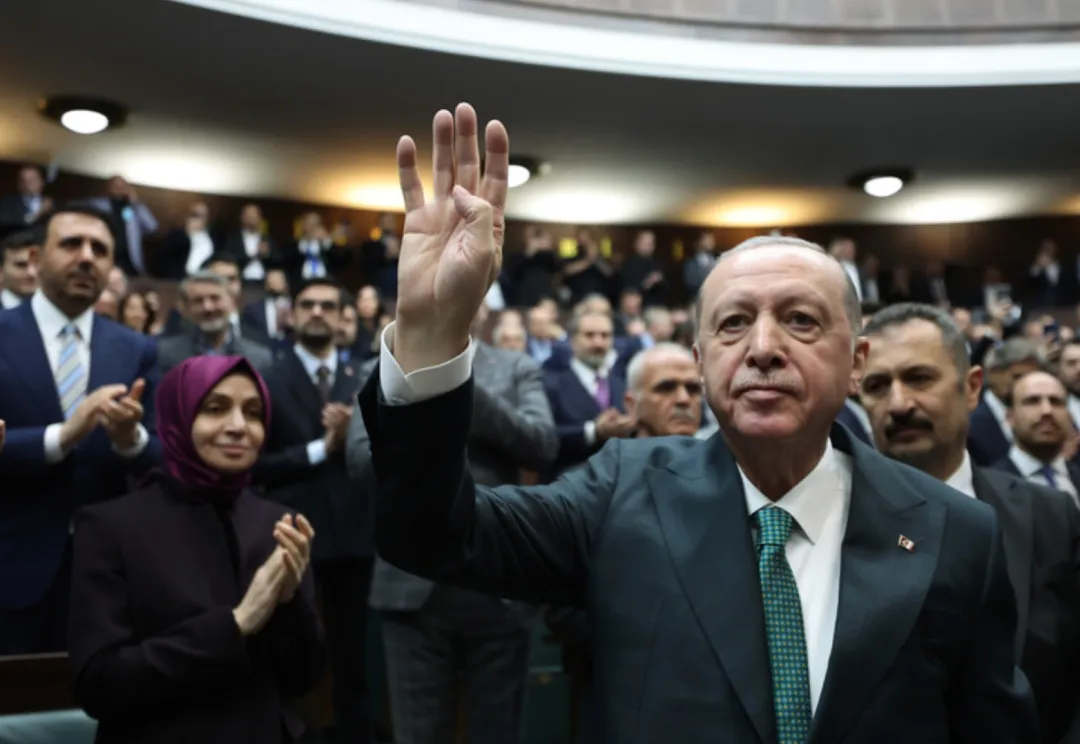 3月11日,土耳其总统埃尔多安(前)在安卡拉出席执政党正义与发展党议会党团会议 新华社发(穆斯塔法·卡亚摄)