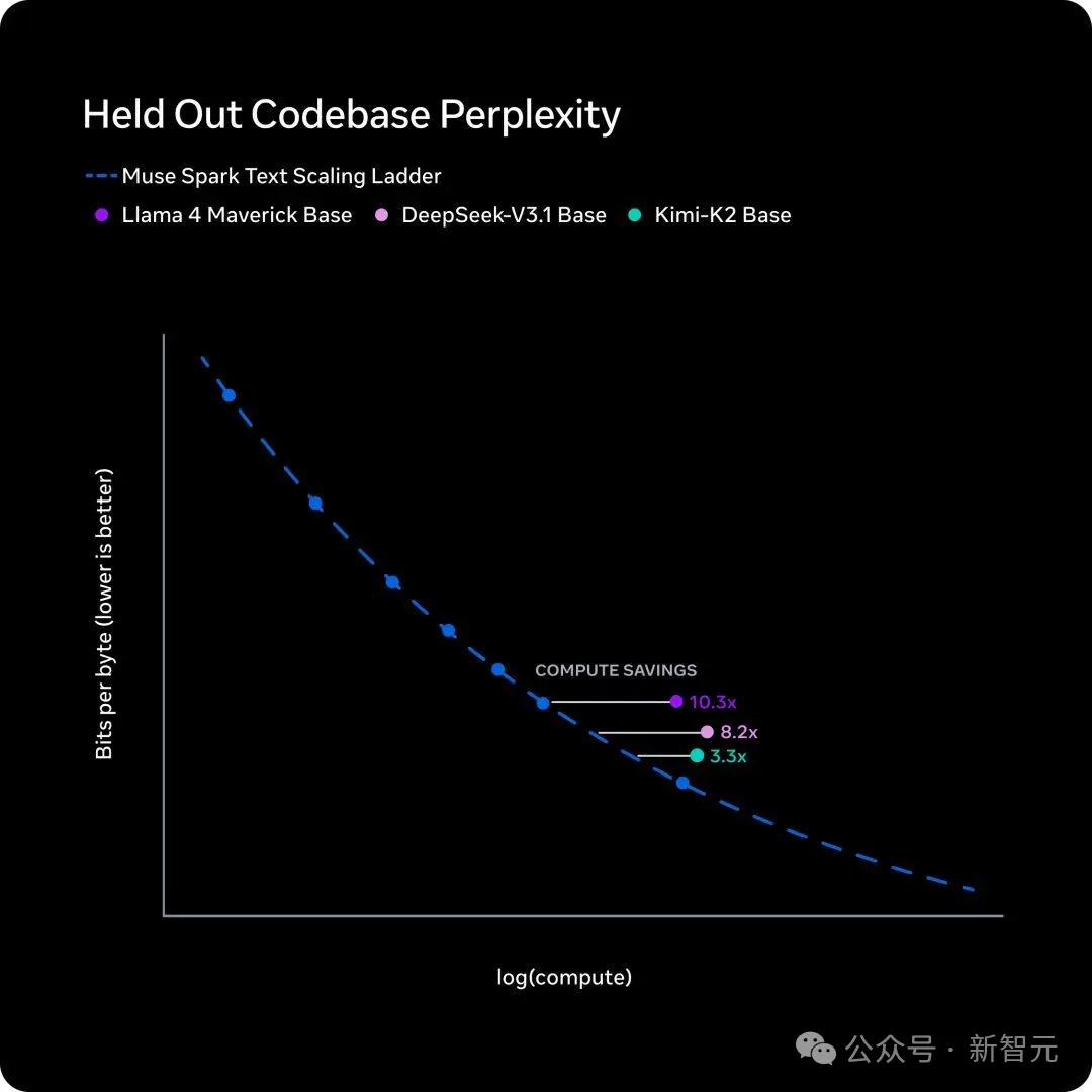 5天后,4月8日,Meta超级智能实验室发布全新模型Muse Spark,公开了一条内部叫做scaling ladder的训练效率曲线,结论也是一句话。