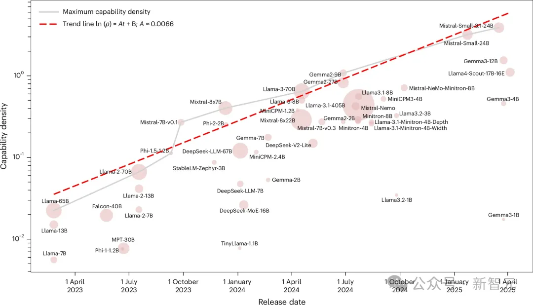 模型智能密度随时间呈指数级增强,达到特定智能水平所需的参数量,每3.5个月下降一半。