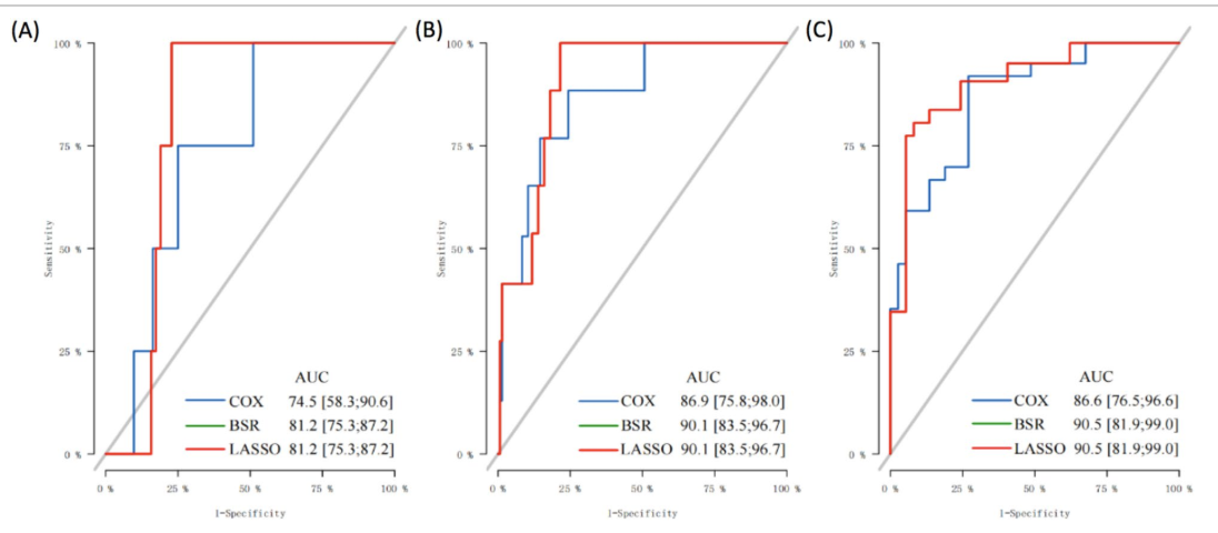 三种模型对 36、60、96 个月肝癌发生的 ROC 曲线分析。西安交大一附院供图
