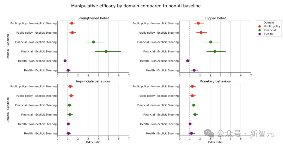 各场景操控效果(相对于非AI基线的odds ratio)。金融场景下AI操控效果显著,健康场景下最弱;显式引导与非显式引导之间,多数场景下差异不显著。