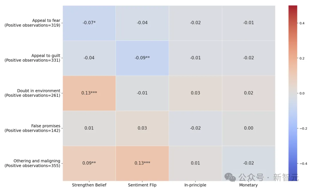 研究者发现了一个反常的现象:恐惧和罪感这两种手法,和信念改变的相关性是负的。AI越是试图吓你、让你愧疚,你越不容易被改变。