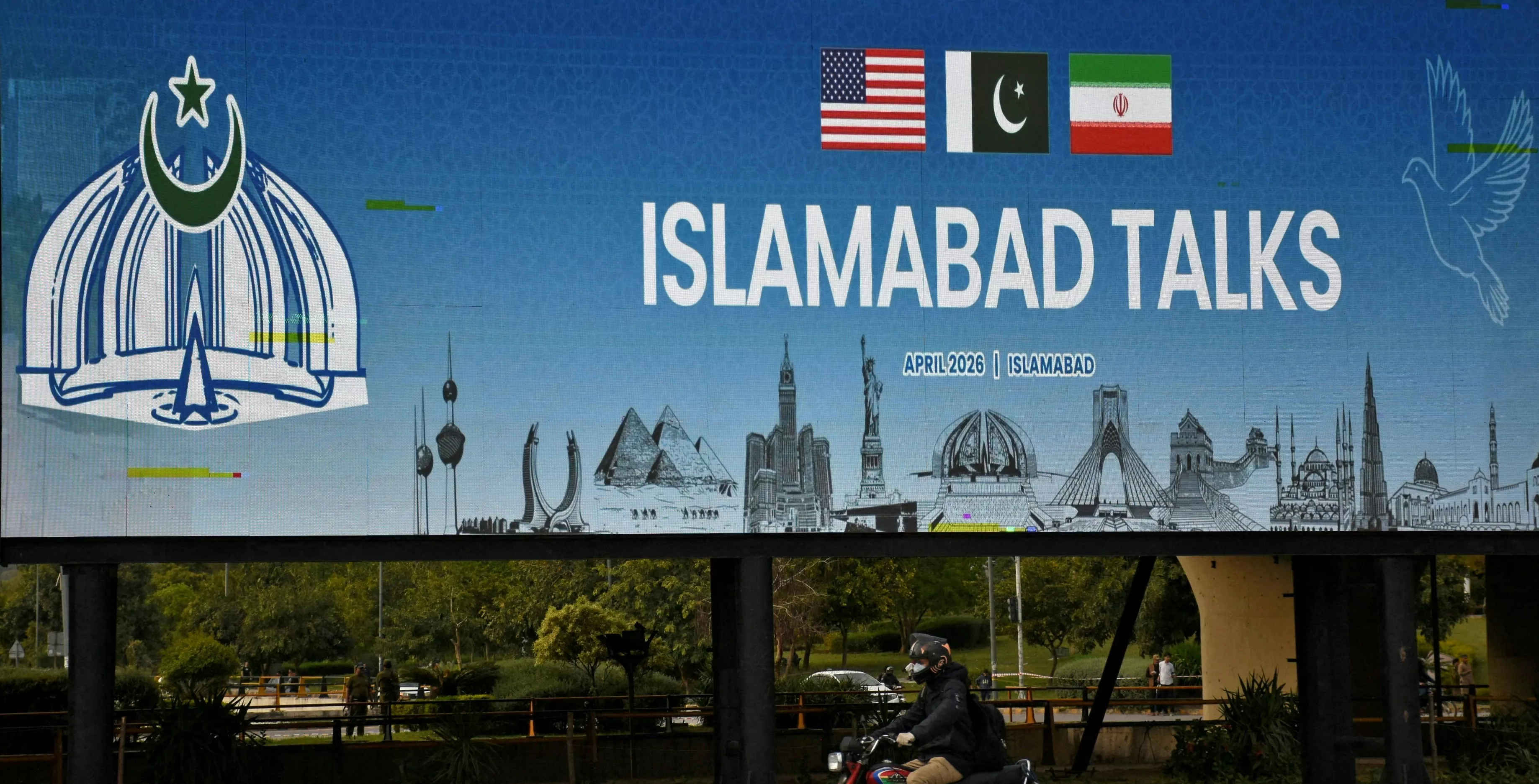 2026年4月10日,巴基斯坦伊斯兰堡(Islamabad),一名男子骑着电单车经过路边竖立的广告牌,巴基斯坦正准备欢迎美国和伊朗举行和平谈判。(Reuters)