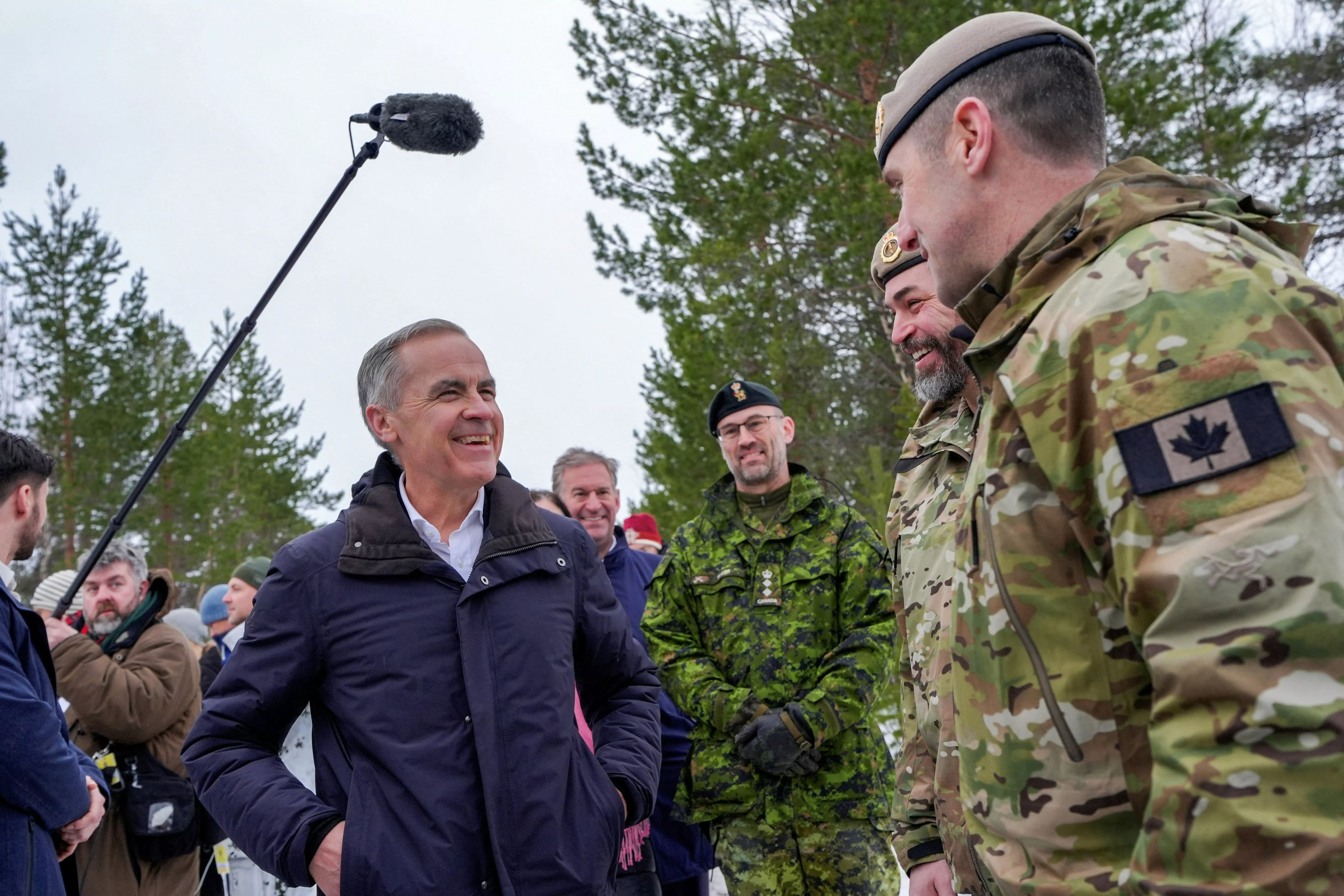 2026年3月13日,加拿大总理卡尼(Mark Carney)在挪威巴杜福斯(Bardufoss)举行的北约盟国“极寒回应2026”(Cold Response 2026)军事演习中会见加拿大士兵。(Reuters)