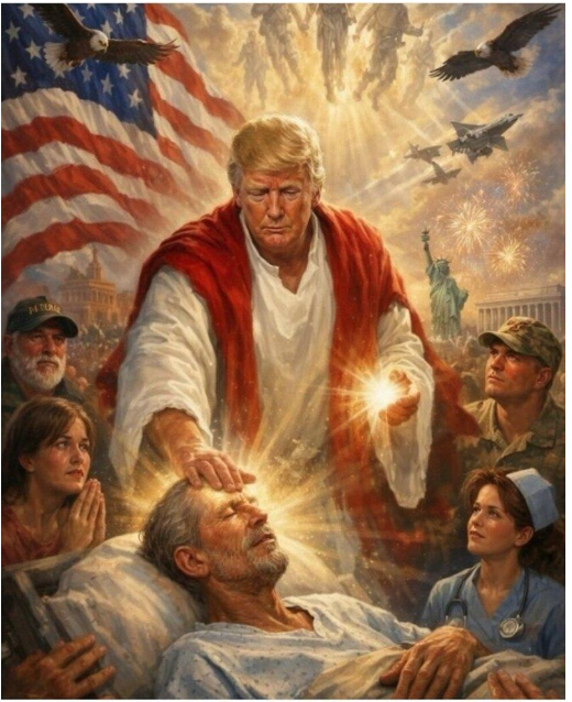 周日晚间,川普自佛罗里达返回华盛顿途中,先发文抨击教宗良十四(Leo XIV),随后又分享一张由AI生成、风格近似宗教画作的图片。画中他身穿白色长袍,一手托著发光球体,另一手置于一名疑似躺在病床上的男子额头上,男子头部泛出光芒,画面呈现出祈祷与治愈的意象。背景则融入老鹰、烟火与自由女神像等爱国象征。