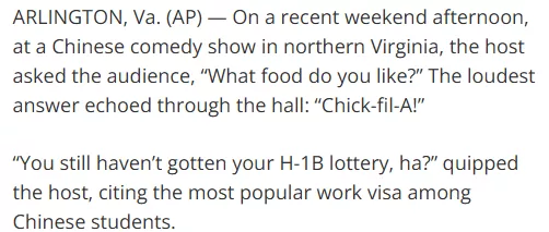 美国对H-1B签证抽签的参与人数有限制。理工科专业学生在F-1学生签证下可以进行三年的选择性实习培训(OPT),而其它专业的学生只有一年。之后,他们一边在Chick-fil-A打工,一边申请工作签证,以便继续在美国工作。