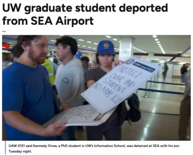 一名就读于University of Washington的博士生,在入境美国时被联邦执法人员当场扣留,并在数小时内被直接遣返回境,其13岁的儿子也被一同带离。