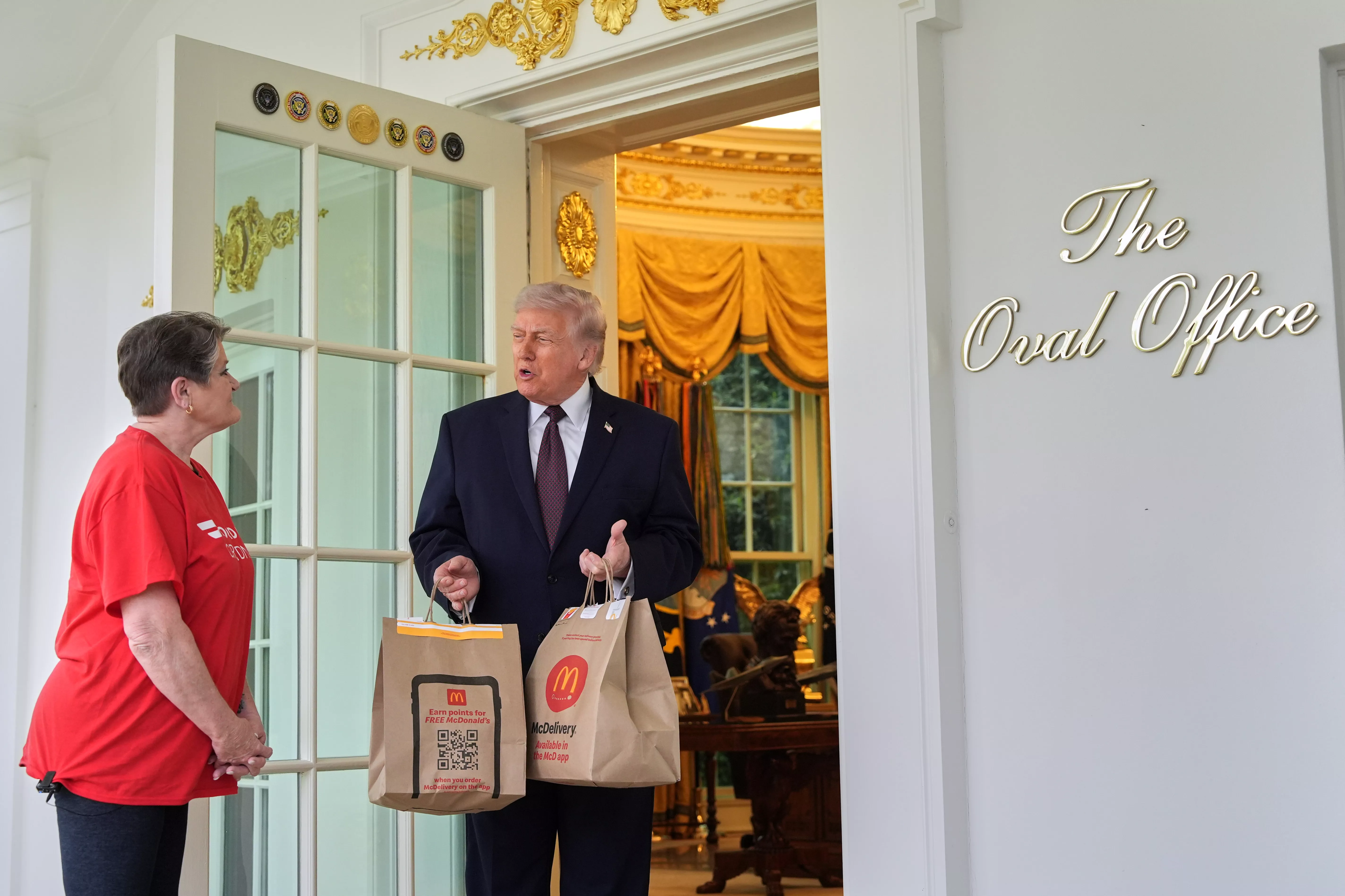 正午过后,随行记者团被引导至白宫大门前,目睹了外卖配送员莎伦·西蒙斯(Sharon Simmons)抵达西翼外柱廊的一幕,莎伦身着印有“DoorDash 奶奶”字样的红色T恤,手里提着两袋麦当劳说道:“总统先生,我有一份给您的 DoorDash 订单。”她随后将袋子递给了川普。
