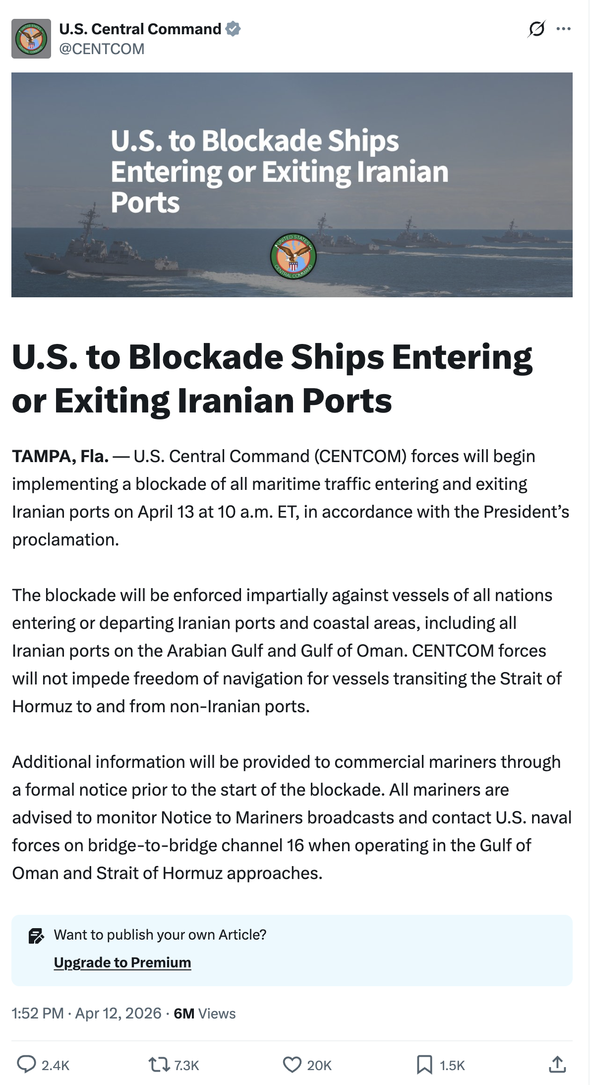 尽管川普的表态极具冲击力,但五角大楼随后披露的执行细节,却显得更为“克制”。根据U.S. Central Command说明,此次行动重点针对伊朗港口及沿海航运,所有进出相关区域的船只都将接受检查,但并未完全封锁霍尔木兹海峡本身。