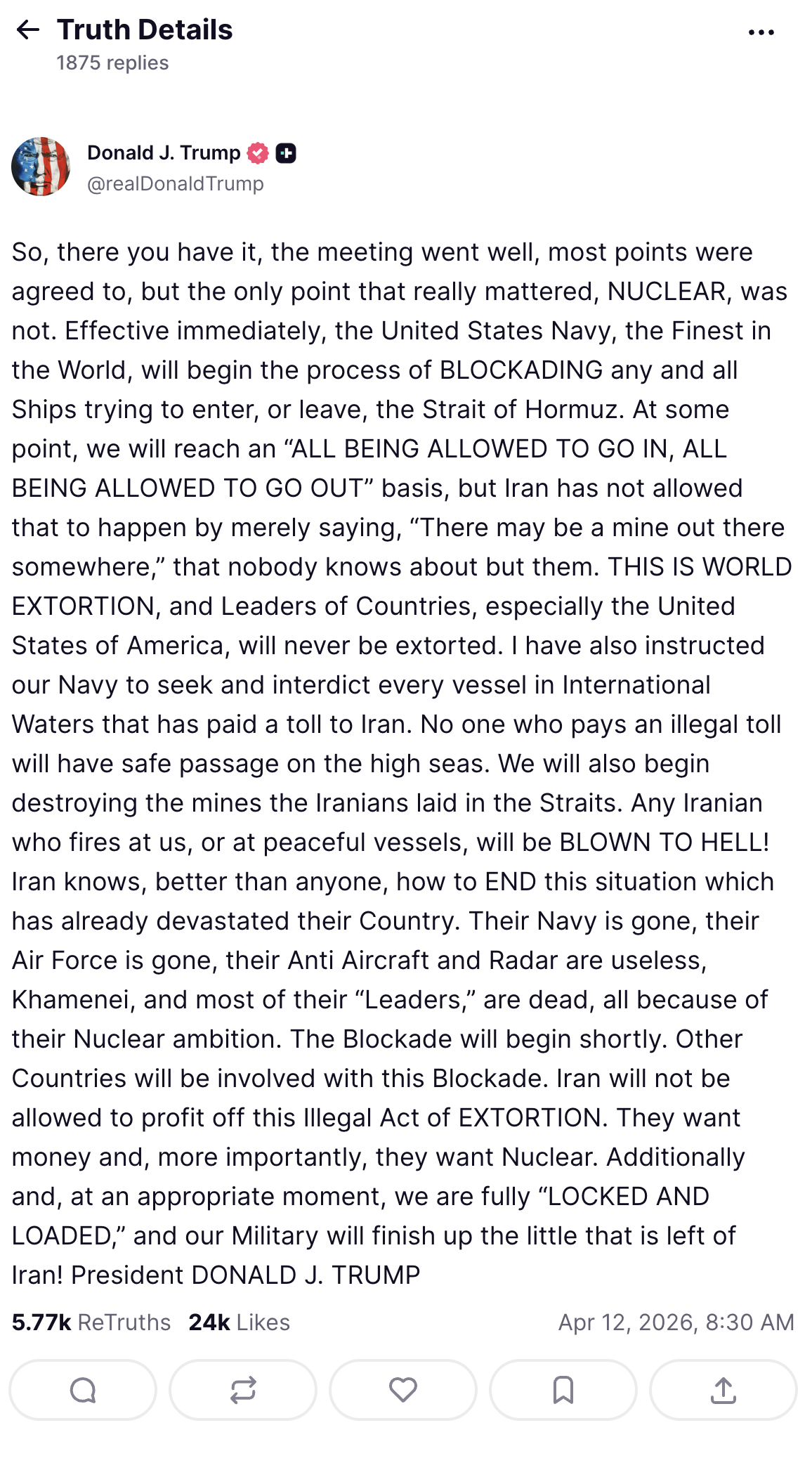 但与此同时,川普在社交媒体上的强硬警告——“任何靠近封锁线的伊朗船只都将被立即消灭”——又让局势显得异常危险。