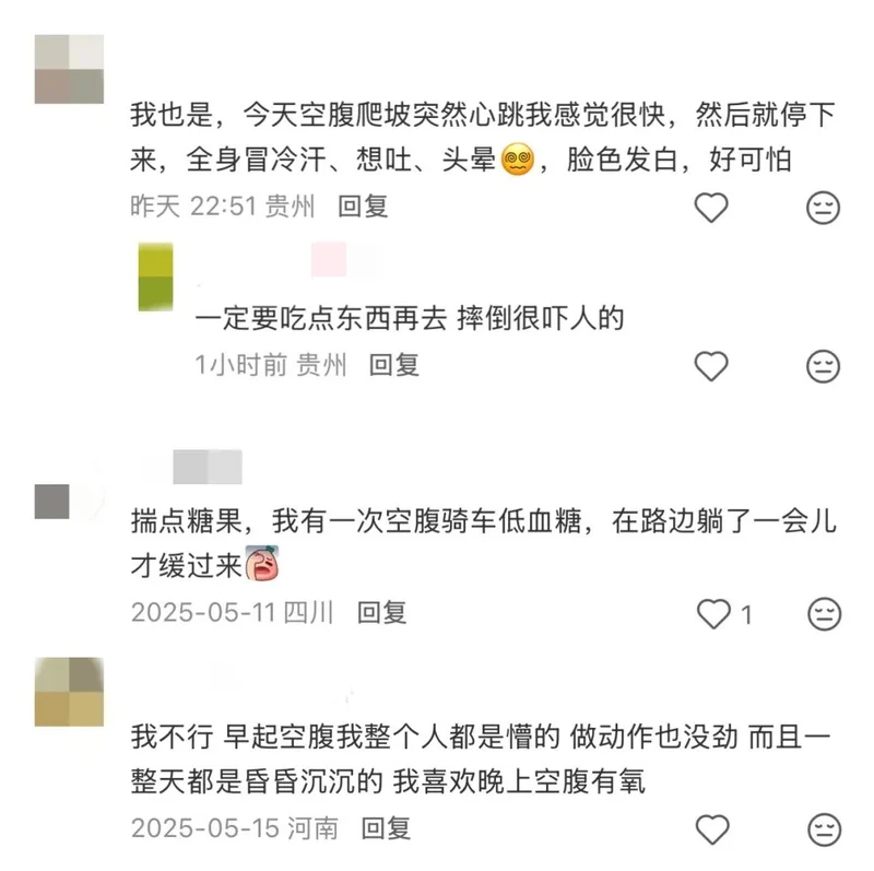 最近葡萄经常刷相关内容的评论区里,不少网友分享了自己空腹锻炼后的不良反应:低血糖、头晕、心慌,甚至有人练到一半差点晕倒……