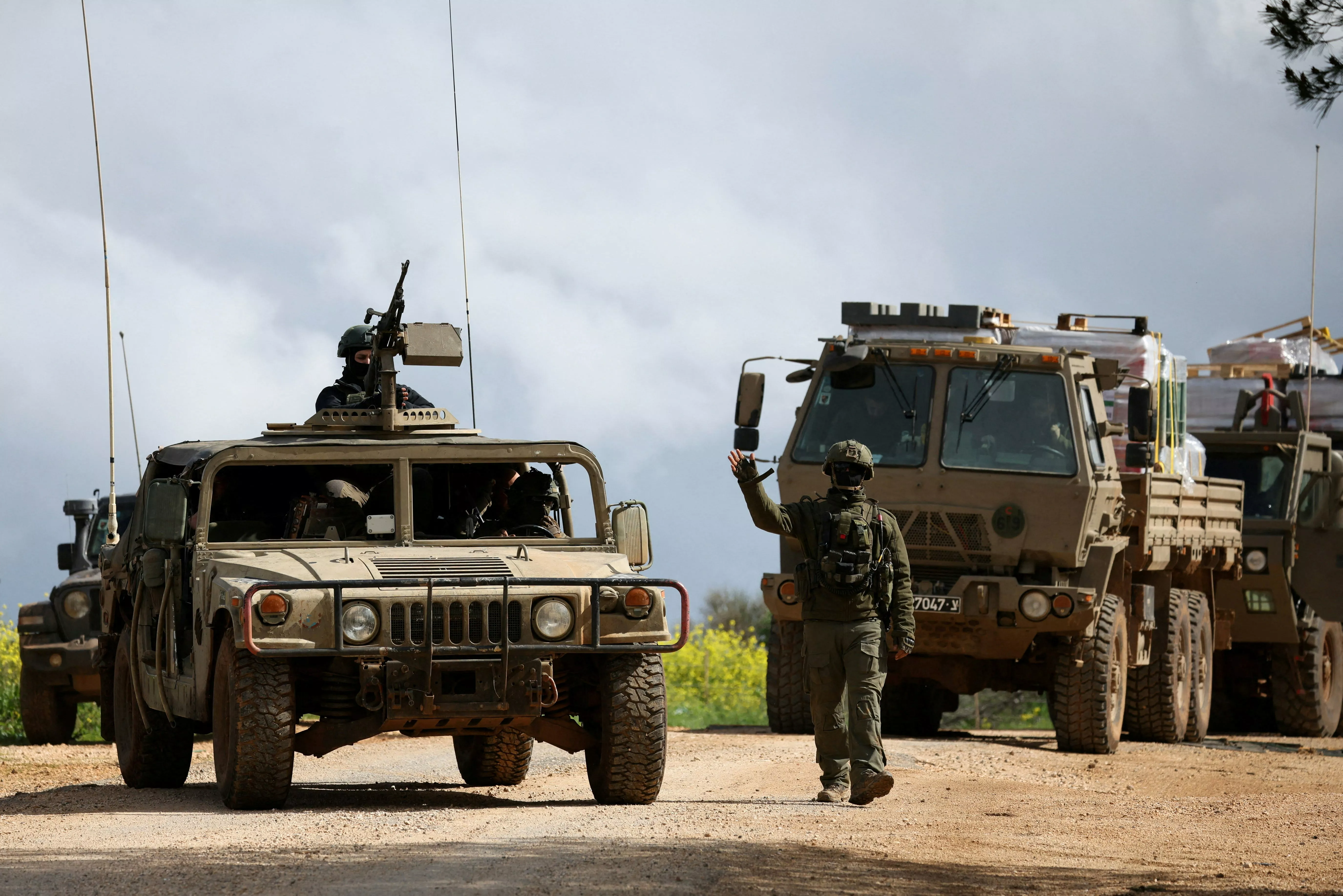 2026年3月30日,黎巴嫩南部的以黎边境附近,一名以色列士兵一边在军车旁走动,一边做手势。 (Reuters)