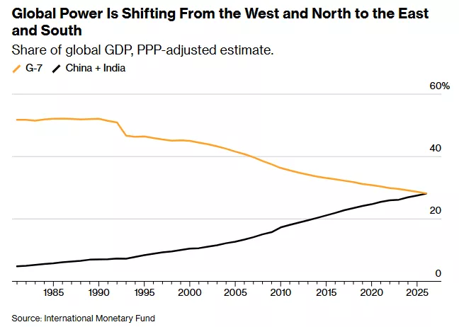 第一是全球权力在国家之间持续重新分配 。 在过去五个世纪中集中于西方和北方的权力,正在向东方和南方分散 。 从 1990 年到 2025 年,七国集团(法国 、 德国 、 意大利 、 加拿大 、 日本 、 英国和美国)在全球国内生产总值中的占比,从一半下降到四分之一;而中国 、 印度和东南亚的占比,则从 15% 上升到 55%。