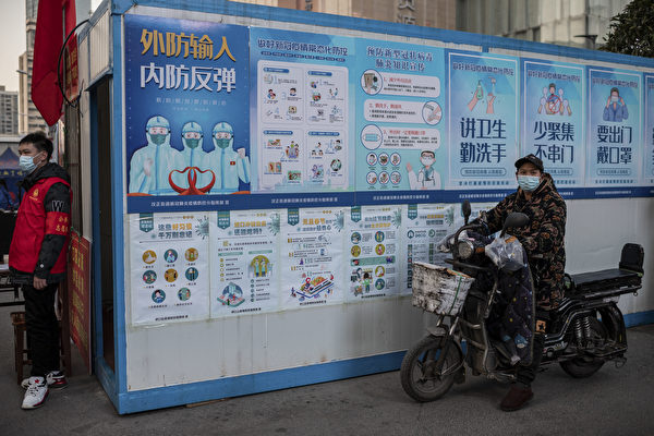 图为2021年1月13日中国武汉街头的一个献血采血点,戴着红袖章的工作人员(左)站在入口处。(Nicolas Asfouri / AFP)