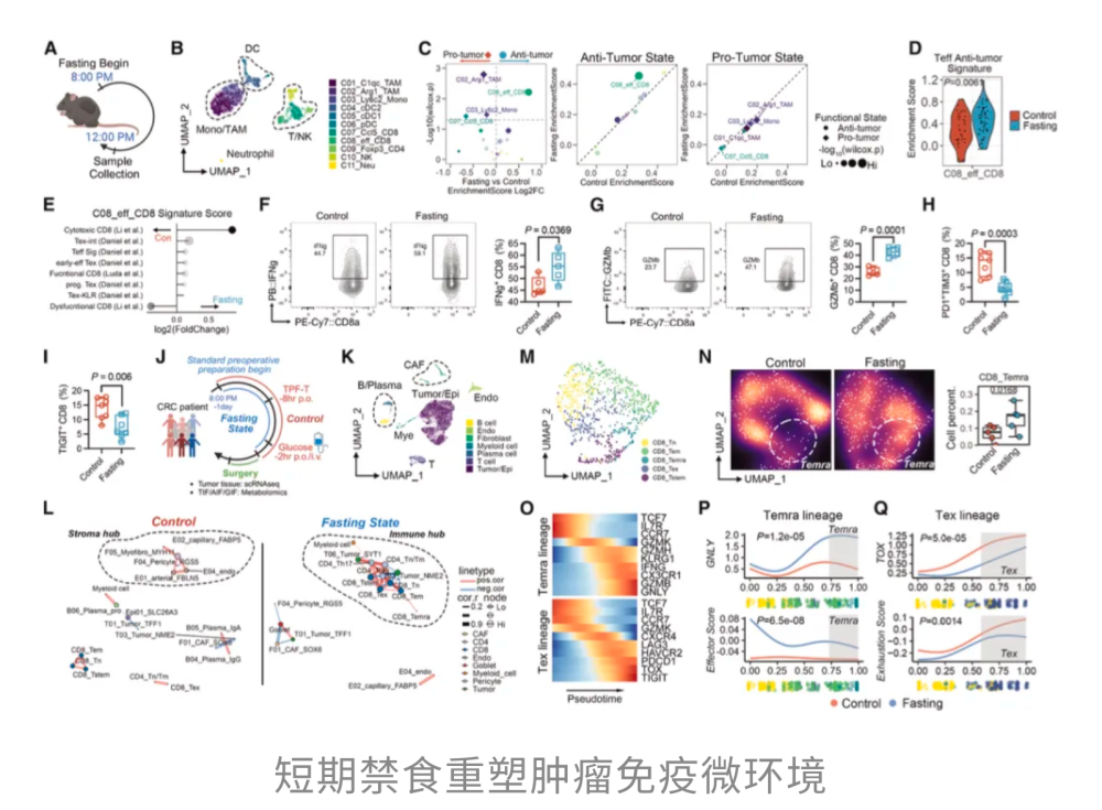 结果观察到,短期禁食同样能够在人类结直肠癌患者体内重塑肿瘤免疫微环境。CD8⁺T细胞同样更倾向于走向细胞毒性更强、耗竭程度更低的状态。
