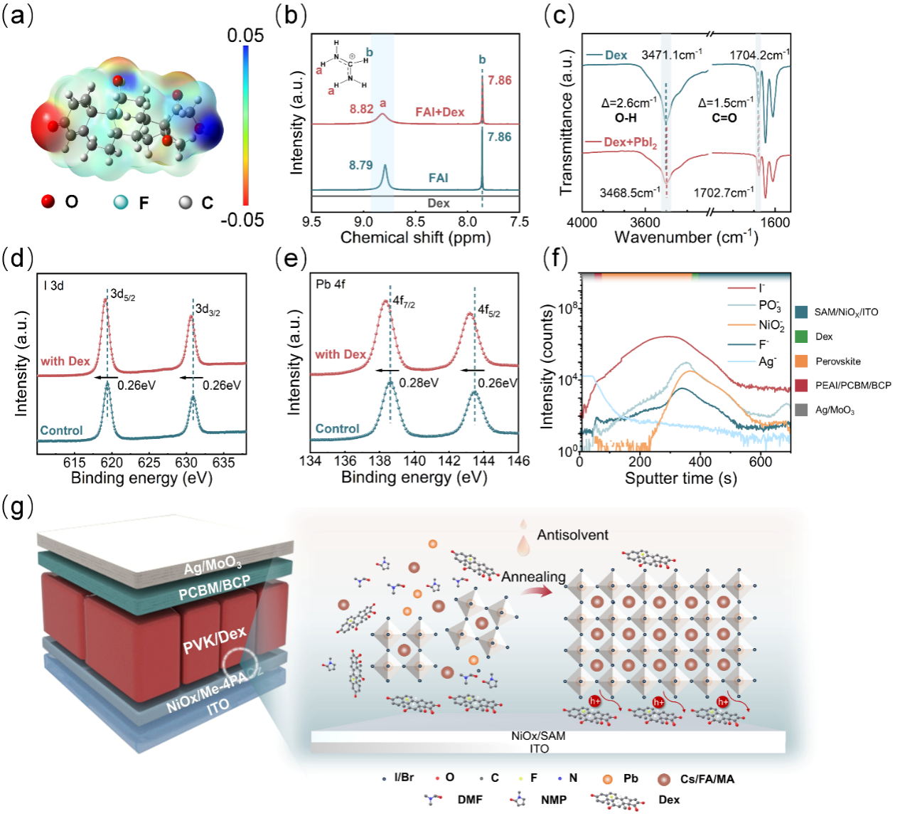 图1. Dex与钙钛矿的相互作用及其界面富集行为