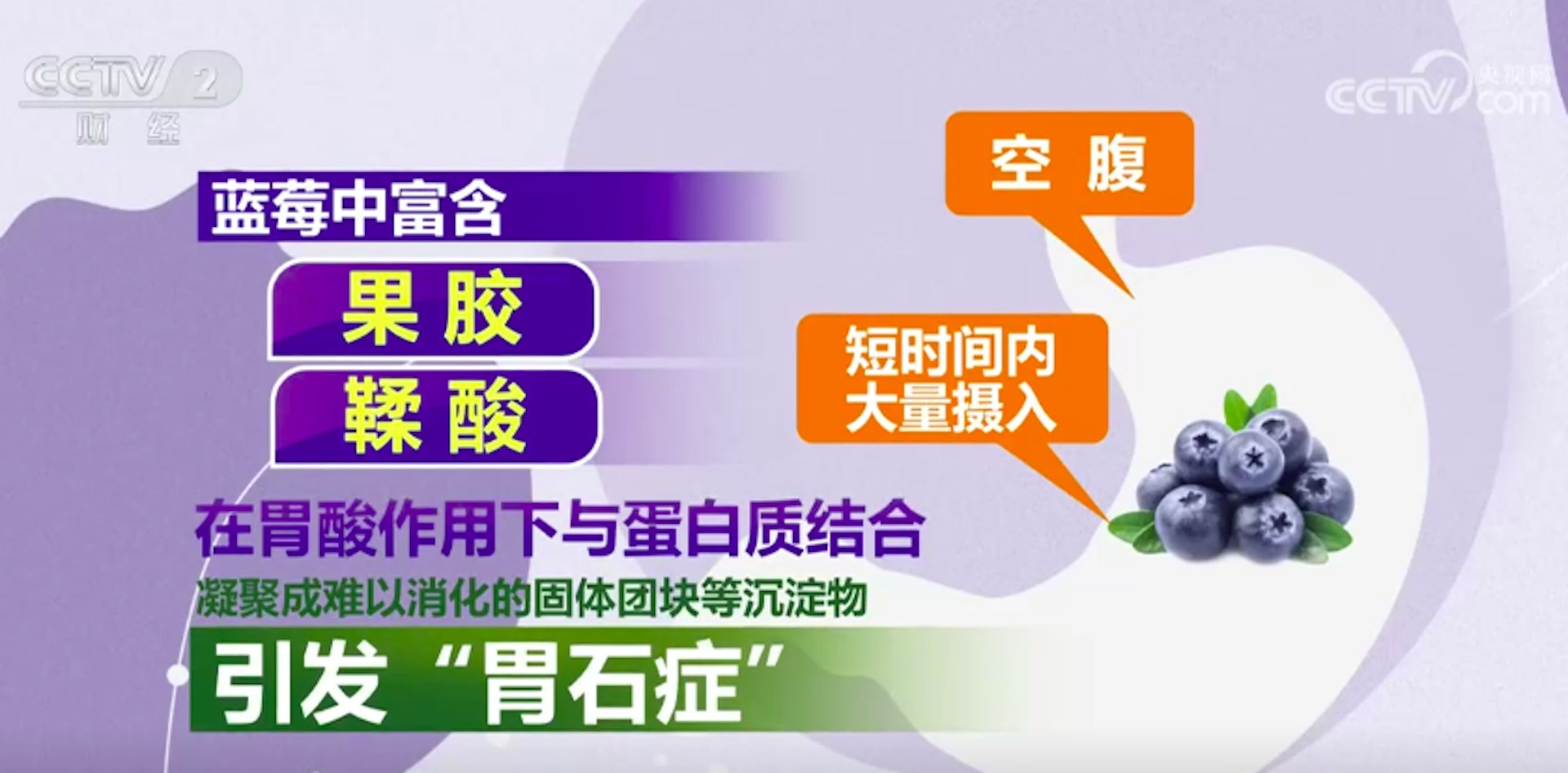 在很多人的印象里,过量食用柿子、山楂易得胃石症,怎么蓝莓吃多了也会这样?蓝莓中富含果胶与鞣酸,若空腹或短时间内大量摄入,这些成分会在胃酸作用下与蛋白质结合,逐渐凝聚成难以消化的固体团块等沉淀物,引发「胃石症」。轻则可致胃胀胃痛,重则引发胃溃疡甚至消化道梗阻。