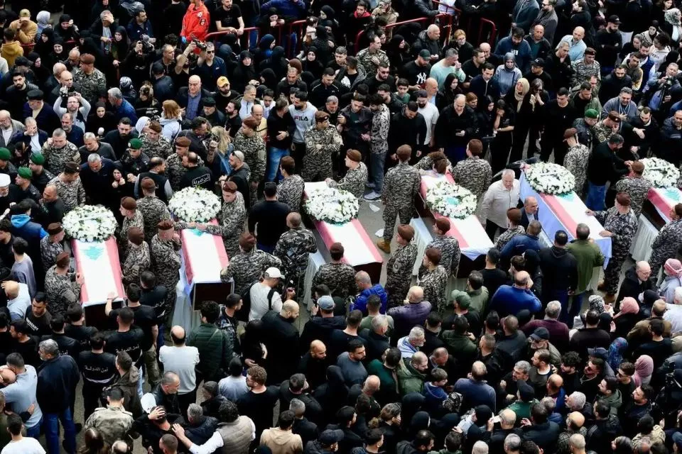 当地时间2026年4月11日,在黎巴嫩西顿市,人们参加遭以军空袭丧生的13名安全人员的葬礼/新华社发(阿里·哈希绍摄)