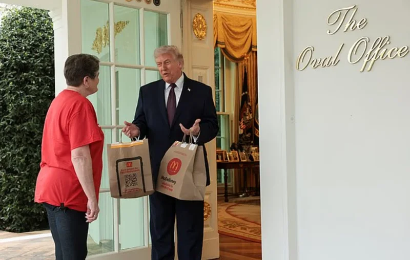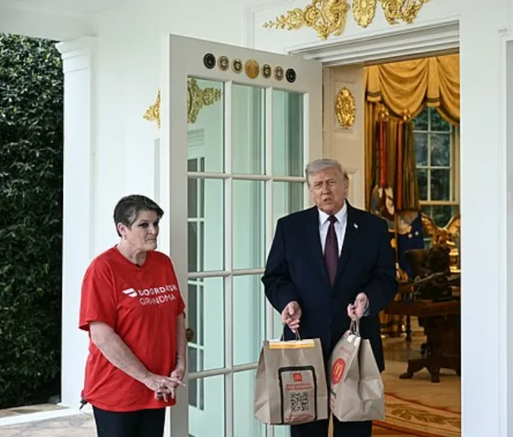 周一,特朗普在白宫点了麦当劳外卖。一名Doordash的外卖大妈给他送餐上门,他亲自开门取货。